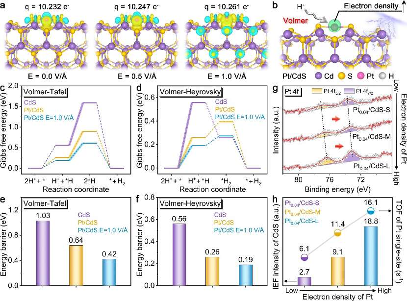 1. 極化誘導電子重排:利用CdS的定向極化電場作為微觀“調(diào)節(jié)器”,有效極化了Pt單原子的原子電荷分布,精準調(diào)控了Pt的化學態(tài)與電子結構。