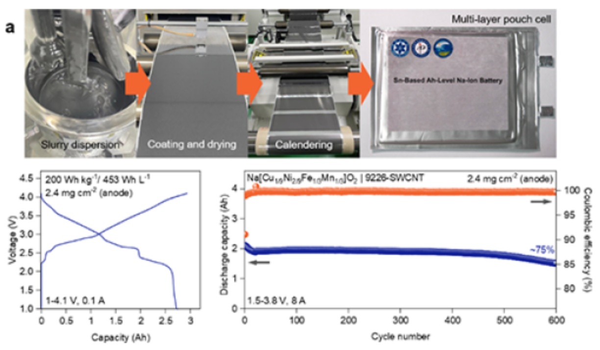 基于這個策略,研究制備出的微米錫負極在0.1 A/g下具有789.4 mAh/g的高可逆容量,并在2 A/g的大電流下循環(huán)6000次后,容量保持率仍達87.6%?;诠锛壏糯笾苽涞奈⒚族a負極,研究制備了安時級鈉離子電池,實現(xiàn)了超過453 Wh/L的高體積能量密度,并在4C倍率下實現(xiàn)穩(wěn)定循環(huán)。此外,該電池還展現(xiàn)出優(yōu)異的低溫性能,綜合指標優(yōu)于商業(yè)磷酸鐵鋰電池。