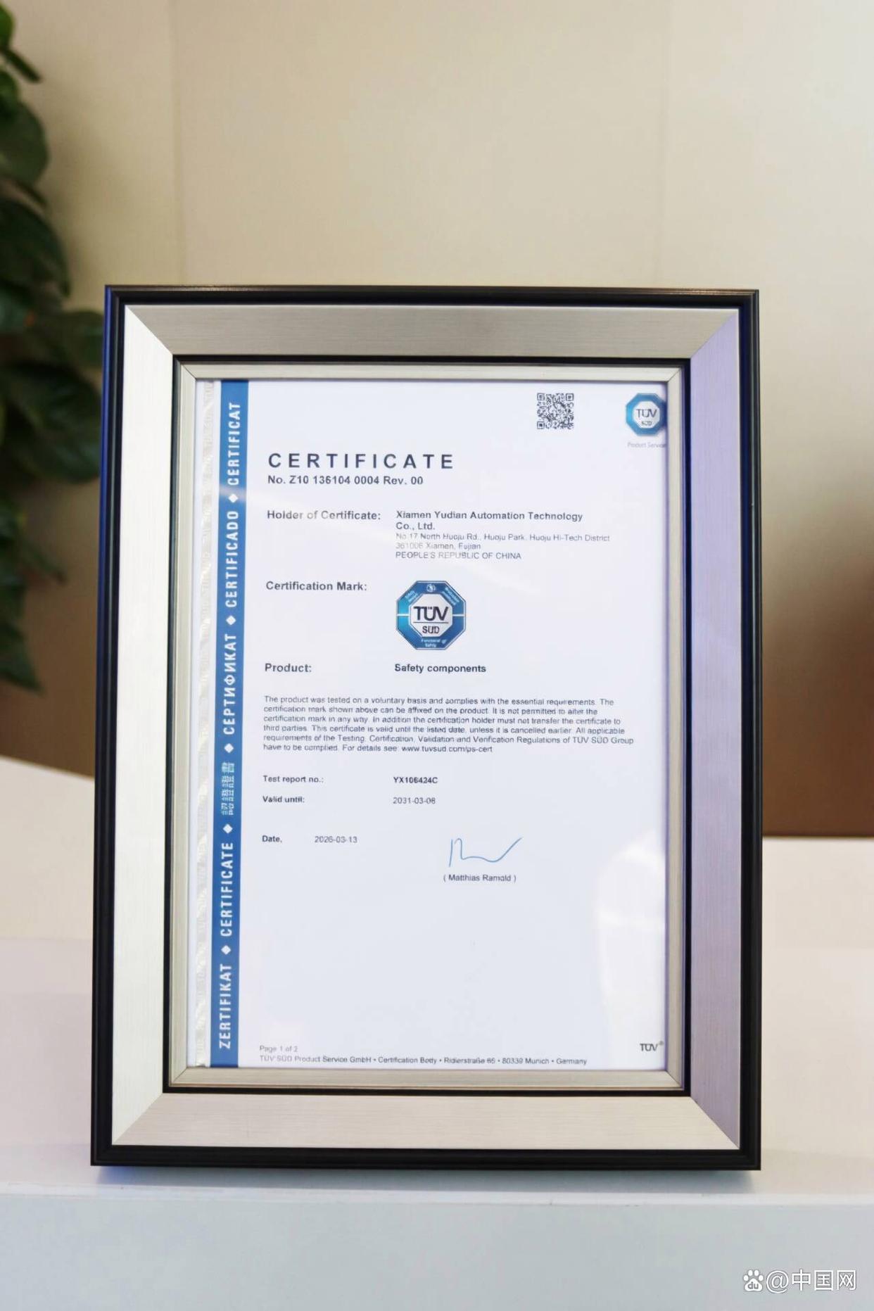 TüV南德向宇電頒證。