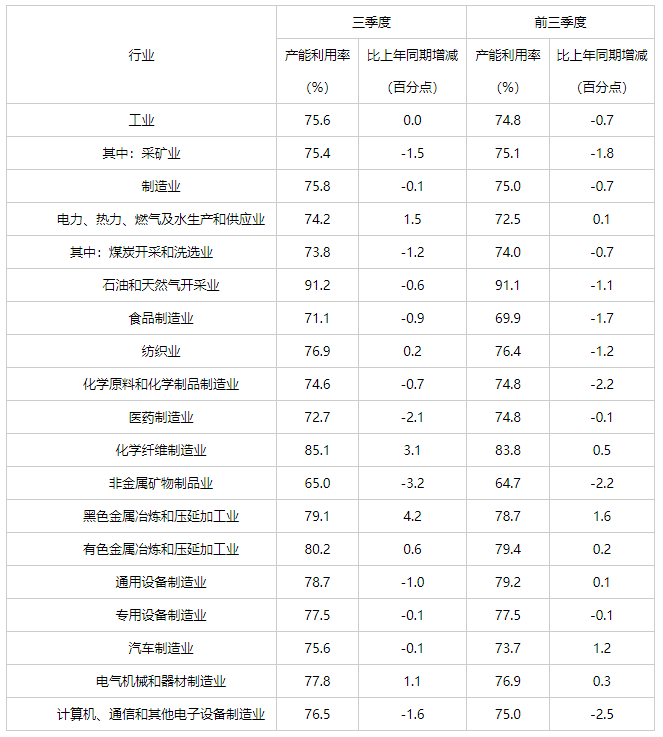 分主要行業(yè)看,三季度,煤炭開采和洗選業(yè)產(chǎn)能利用率為73.8%,食品制造業(yè)為71.1%,紡織業(yè)為76.9%,化學(xué)原料和化學(xué)制品制造業(yè)為74.6%,非金屬礦物制品業(yè)為65.0%,黑色金屬冶煉和壓延加工業(yè)為79.1%,有色金屬冶煉和壓延加工業(yè)為80.2%,通用設(shè)備制造業(yè)為78.7%,專用設(shè)備制造業(yè)為77.5%,汽車制造業(yè)為75.6%,電氣機(jī)械和器材制造業(yè)為77.8%,計算機(jī)、通信和其他電子設(shè)備制造業(yè)為76.5%。
