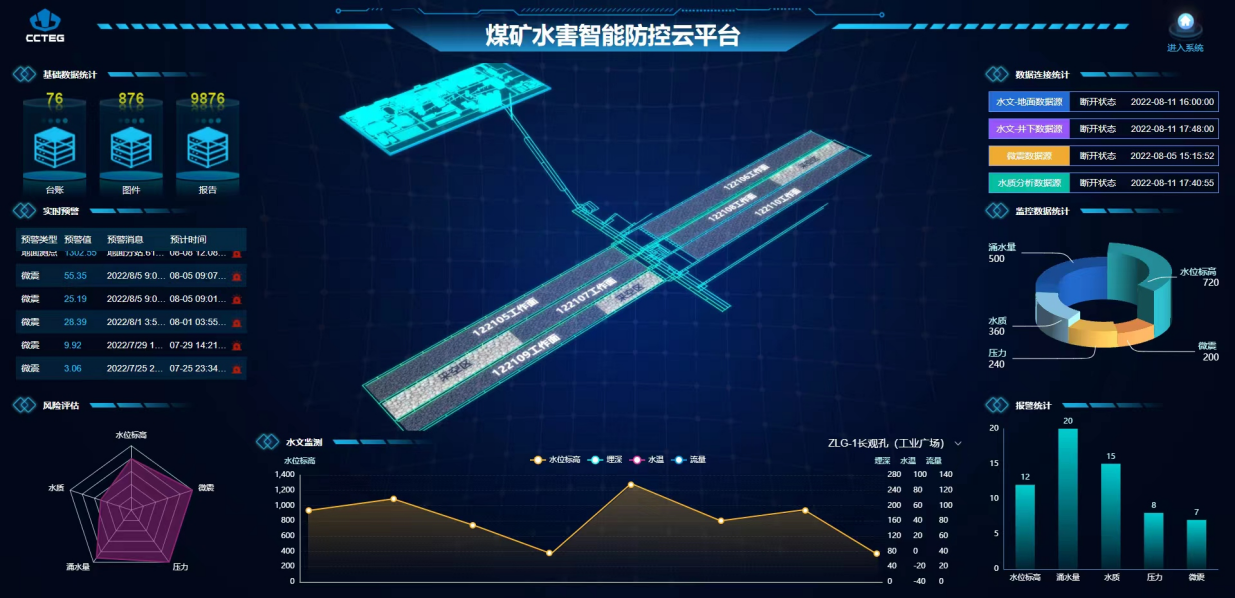 在"一礦一策"思路的指引下,西安研究院為霍洛灣煤礦水害防治智能化建設提供定制化服務,建立了水害風險防控預警系統(tǒng)。該系統(tǒng)具備水文地質基礎數據管理、水害風險分析評價、水害監(jiān)測預警及突水仿真演練等功能。西安研究院根據霍洛灣煤礦水文地質基礎數據資料,按照《煤礦防治水細則》要求,對該煤礦水害防治臺賬、圖件及報告等數據資料進行標準化管理,基于"三圖雙預測""五圖雙系數"等方法,結合水文監(jiān)測系統(tǒng)獲取實時監(jiān)測數據,對煤礦水害風險進行動態(tài)監(jiān)測預警及分析評估,并為微震、電法監(jiān)測預警預留了程序接口。同時,借助煤礦三維井巷突水漫延推演方法,動態(tài)刻畫了突水發(fā)生后水流在三維井巷中的漫延過程,并推演出水淹過程人員動態(tài)避災路線,實現煤礦突水人員逃生仿真演練。