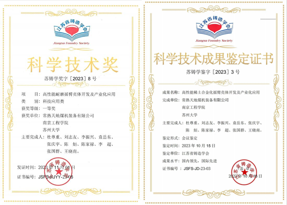近日,2023年江蘇省鑄造學(xué)會(huì)科學(xué)技術(shù)獎(jiǎng)?lì)C獎(jiǎng)儀式在江蘇江陰順利召開,中國煤科上海研究院常熟煤機(jī)(以下簡稱上海煤科常熟煤機(jī))“高性能耐磨搖臂殼體開發(fā)及產(chǎn)業(yè)化應(yīng)用”項(xiàng)目榮獲江蘇省鑄造學(xué)會(huì)科學(xué)技術(shù)一等獎(jiǎng),達(dá)到國外知名品牌同類產(chǎn)品的水平。該項(xiàng)目研發(fā)了一種含稀土鑄鋼新材料及相關(guān)工藝,已應(yīng)用于天地上海采掘裝備科技有限公司(以下簡稱天地采掘)大功率采煤機(jī),實(shí)現(xiàn)了國產(chǎn)煤機(jī)替代進(jìn)口煤機(jī)的目標(biāo),取得了顯著的經(jīng)濟(jì)、社會(huì)和環(huán)保效益。