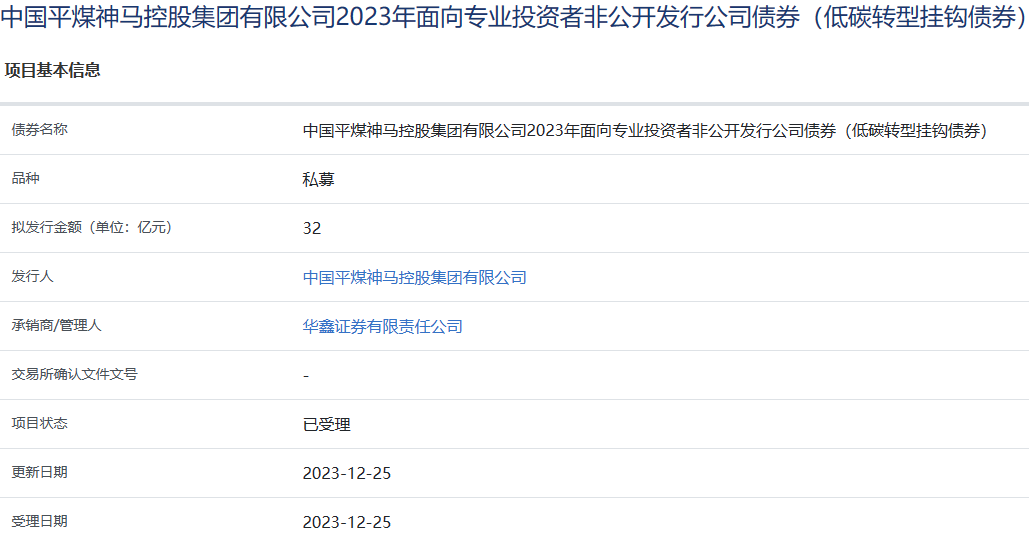 12月25日,中國(guó)平煤神馬控股集團(tuán)有限公司2023年面向?qū)I(yè)投資者非公開(kāi)發(fā)行公司債券(低碳轉(zhuǎn)型掛鉤債券)項(xiàng)目獲上交所受理,本期債券擬發(fā)行金額32億元,承銷商/管理人為華鑫證券。8月8日,經(jīng)中誠(chéng)信國(guó)際綜合評(píng)定,發(fā)行人主體信用評(píng)級(jí)為AAA,評(píng)級(jí)展望為穩(wěn)定。