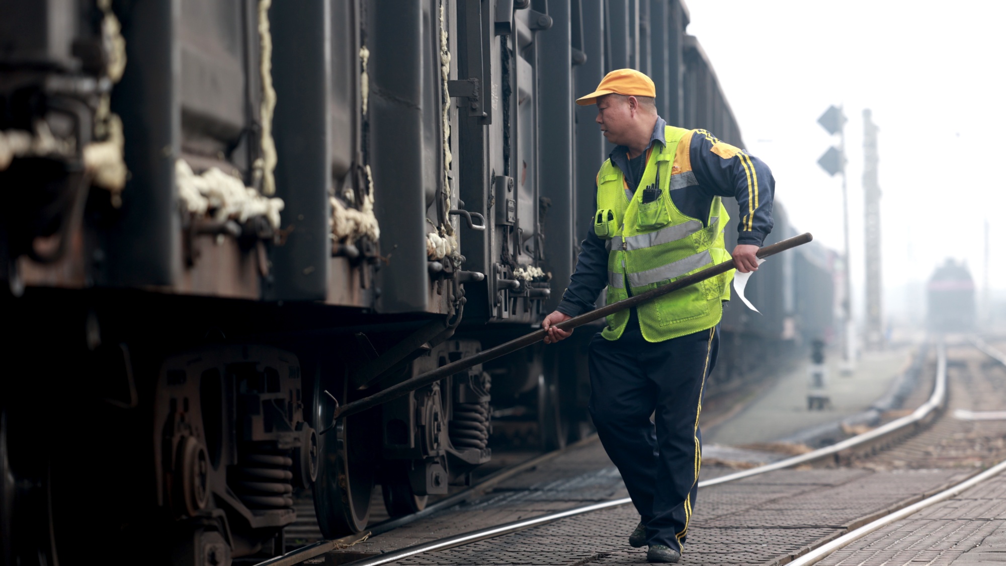 武漢北車(chē)站工作人員在編組電煤列車(chē)(央廣網(wǎng)發(fā)王世煒攝)