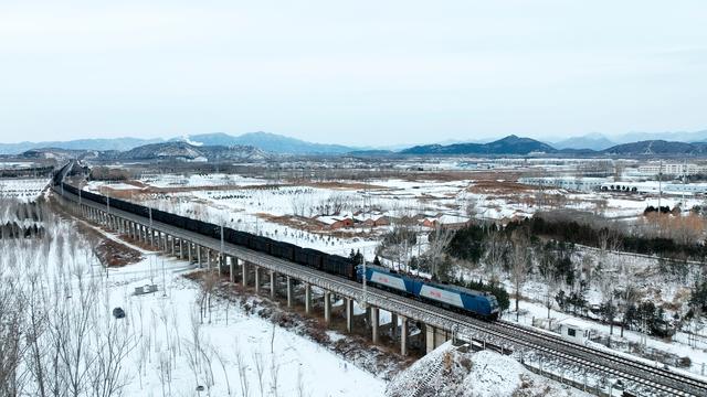 風(fēng)雪中行駛在大秦線上的2萬噸重載列車。(新華社發(fā)葉春蕾攝)