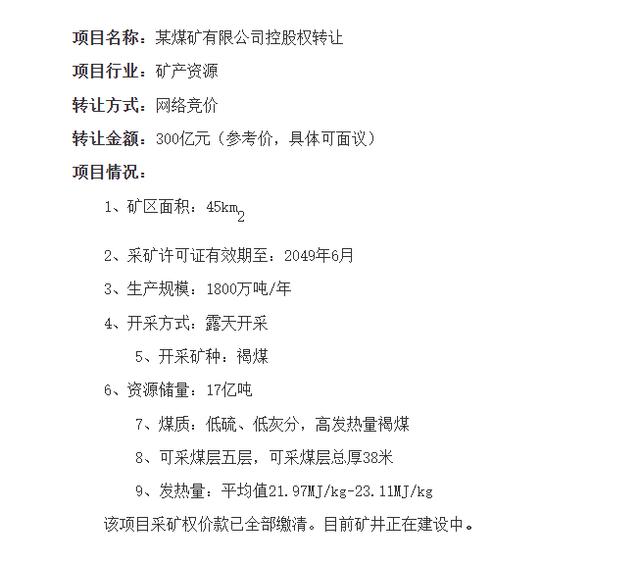 某煤礦有限公司控股權(quán)轉(zhuǎn)讓金額300億元,礦區(qū)面積45km2,生產(chǎn)規(guī)模1800萬噸/年,采礦許可證有效期至2049年6月,資源儲量達(dá)到17億噸,可采煤層五層,可采煤層總厚38米,開采礦種為低硫、低灰分、高發(fā)熱量的褐煤。