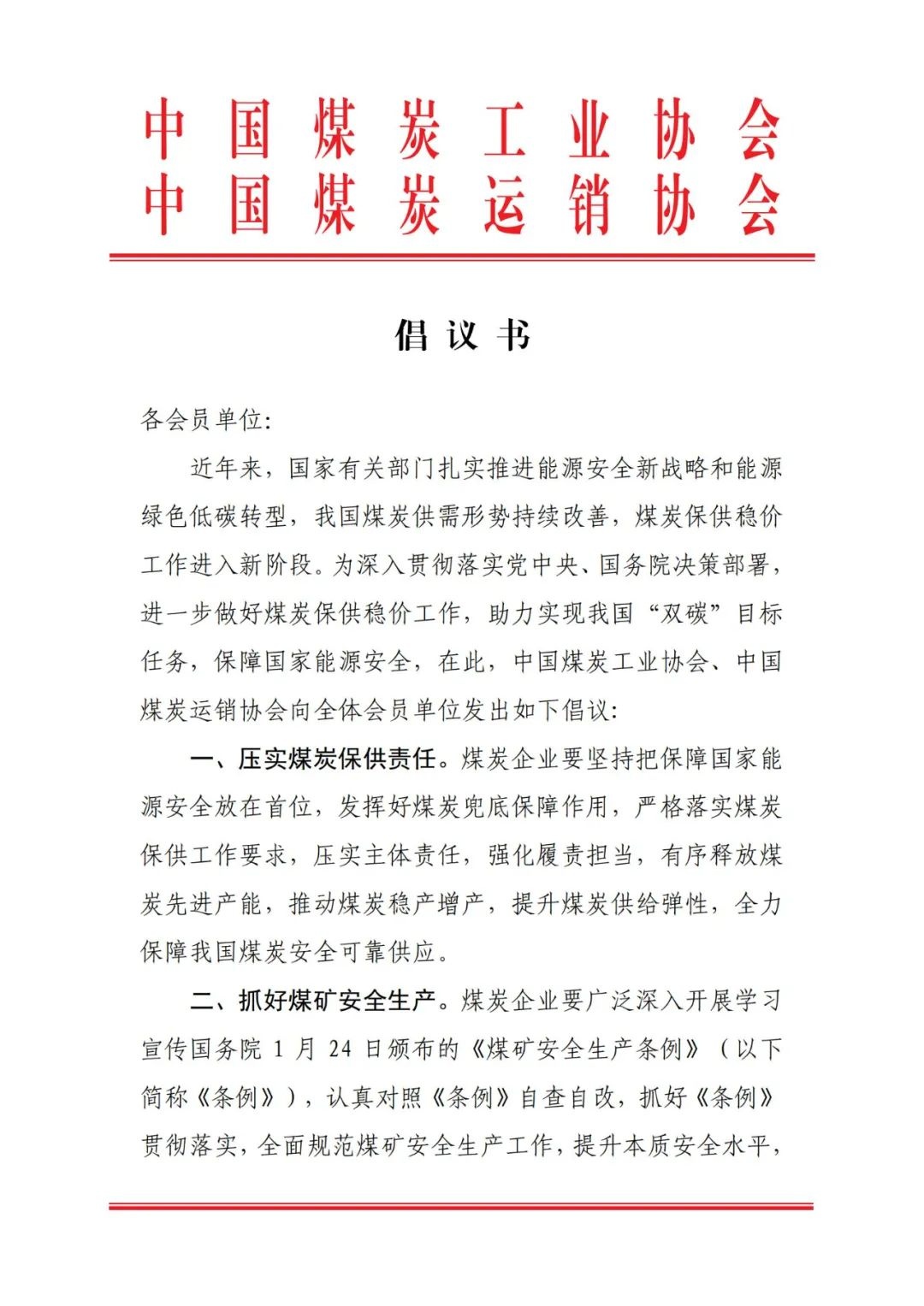 中國(guó)煤炭工業(yè)協(xié)會(huì)和中國(guó)煤炭運(yùn)銷(xiāo)協(xié)會(huì)3月29日共同發(fā)布倡議書(shū)提出,壓實(shí)煤炭保供責(zé)任。煤炭企業(yè)要堅(jiān)持把保障國(guó)家能源安全放在首位,發(fā)揮好煤炭兜底保障作用,嚴(yán)格落實(shí)煤炭保供工作要求,壓實(shí)主體責(zé)任,強(qiáng)化履責(zé)擔(dān)當(dāng),有序釋放煤炭先進(jìn)產(chǎn)能,推動(dòng)煤炭穩(wěn)產(chǎn)增產(chǎn),提升煤炭供給彈性,全力保障我國(guó)煤炭安全可靠供應(yīng)。