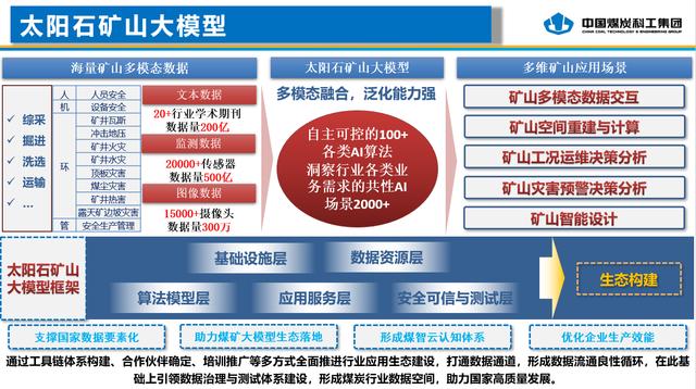 “太陽石礦山大模型”是針對煤礦多維度應用場景的具體需求而設計的。它從基礎設施層、數(shù)據(jù)資源層、算法模型層、應用服務層、安全可信與測試層、行業(yè)生態(tài)層六個層面進行建設。中國煤炭科工集團首席科學家程健介紹,數(shù)據(jù)資源層匯聚了煤炭行業(yè)海量的多模態(tài)數(shù)據(jù),包括安全監(jiān)測數(shù)據(jù)集500億條、視覺圖像數(shù)據(jù)集300萬張、專業(yè)學術期刊數(shù)據(jù)集等。算法模型層可支撐自主可控的100+各類AI算法;應用服務層包括礦山多模態(tài)數(shù)據(jù)交互、礦山空間重建與計算、礦山工況運維決策分析、礦山災害預警決策分析、礦山智能設計等。