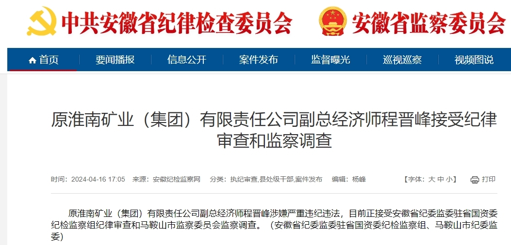 原標(biāo)題:原淮南礦業(yè)(集團(tuán))有限責(zé)任公司副總經(jīng)濟(jì)師程晉峰接受紀(jì)律審查和監(jiān)察調(diào)查