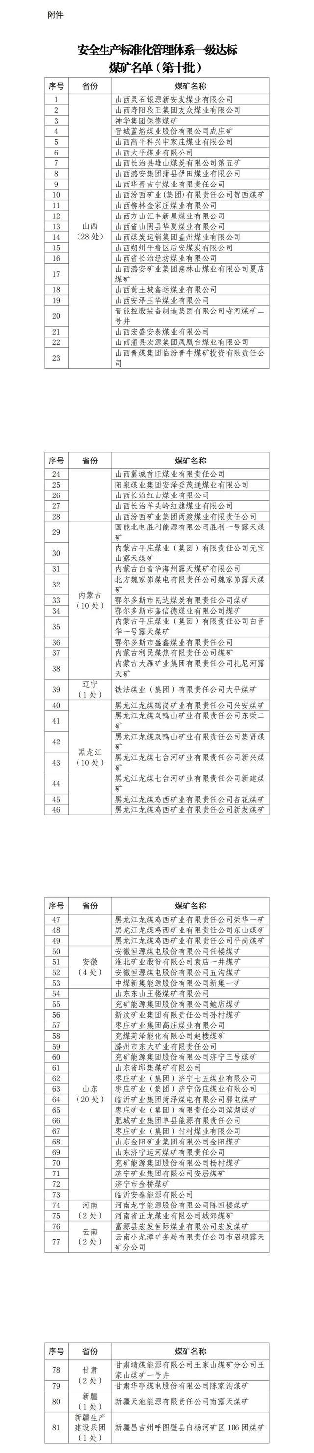 相關(guān)鏈接:安全生產(chǎn)標(biāo)準(zhǔn)化管理體系一級(jí)達(dá)標(biāo)煤礦名單(第十批)