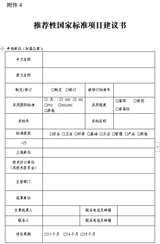 ?。ǘ┥陥?bào)材料。申報(bào)單位應(yīng)當(dāng)按照《礦山安全標(biāo)準(zhǔn)工作管理辦法》規(guī)定的格式和要求報(bào)送項(xiàng)目匯總表(見附件1)、建議立項(xiàng)的書面意見、礦山安全標(biāo)準(zhǔn)項(xiàng)目建議書(見附件2)、標(biāo)準(zhǔn)草案,申報(bào)國(guó)家標(biāo)準(zhǔn)項(xiàng)目的,應(yīng)當(dāng)同時(shí)報(bào)送國(guó)家標(biāo)準(zhǔn)項(xiàng)目建議書(見附件3、附件4)。申報(bào)強(qiáng)制性國(guó)家標(biāo)準(zhǔn)的應(yīng)當(dāng)同時(shí)報(bào)送預(yù)研報(bào)告和項(xiàng)目論證會(huì)議紀(jì)要等材料。項(xiàng)目建議書電子版可在礦山安全標(biāo)準(zhǔn)服務(wù)平臺(tái)“下載中心”欄目下載。