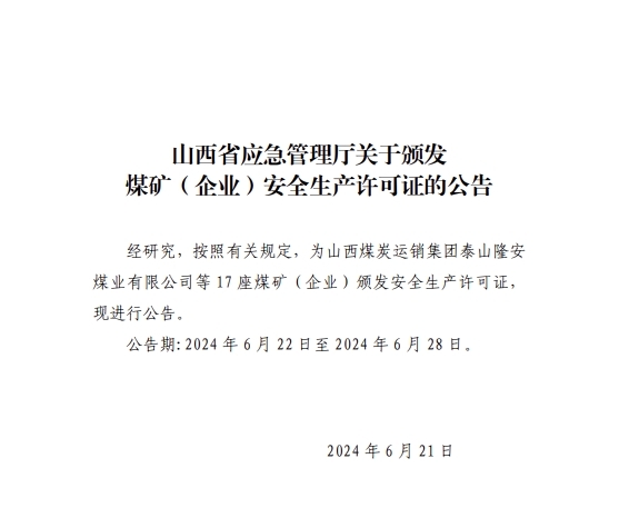 經(jīng)研究,按照有關(guān)規(guī)定,為山西煤炭運(yùn)銷集團(tuán)泰山隆安煤業(yè)有限公司等17座煤礦(企業(yè))頒發(fā)安全生產(chǎn)許可證,現(xiàn)進(jìn)行公告。