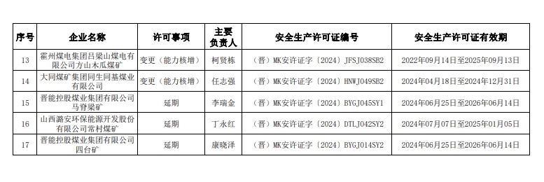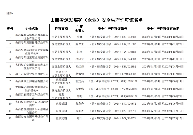 山西省應(yīng)急管理廳關(guān)于頒發(fā)煤礦(企業(yè))安全生產(chǎn)許可證的公告