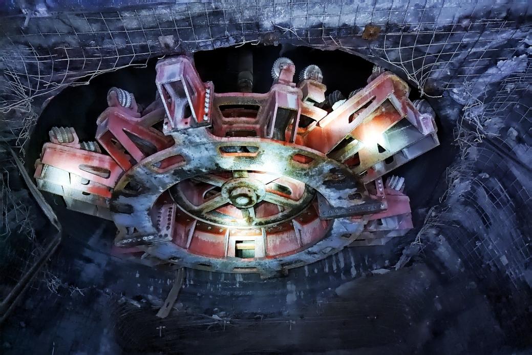此次施工是國內(nèi)首次自主實施6.6米大孔徑反井鉆孔作業(yè),無經(jīng)驗可借鑒。為實現(xiàn)突破,該公司對傳統(tǒng)反井鉆機(jī)進(jìn)行全面升級改造:動力系統(tǒng)采用高功率電機(jī)和大扭矩液壓馬達(dá),配備全液壓驅(qū)動系統(tǒng),通過主泵站和副泵站協(xié)同工作,精準(zhǔn)控制動力頭動作,主機(jī)功率達(dá)282.5千瓦,最大扭矩400千?!っ?/span>;結(jié)構(gòu)上以高強(qiáng)度鋼材制作框架,優(yōu)化支撐結(jié)構(gòu),提升設(shè)備穩(wěn)定性與可靠性;鉆頭改為拼裝式階梯結(jié)構(gòu),通過階梯式擴(kuò)孔分解作業(yè)壓力,優(yōu)化滾刀布局,采用“擠壓—剪切”復(fù)合破巖機(jī)制提升效率與質(zhì)量;配套吊裝系統(tǒng)最大起吊3.2噸,工作幅度8.2米,效率較傳統(tǒng)人工吊裝提升5倍,安全事故率降低90%。
