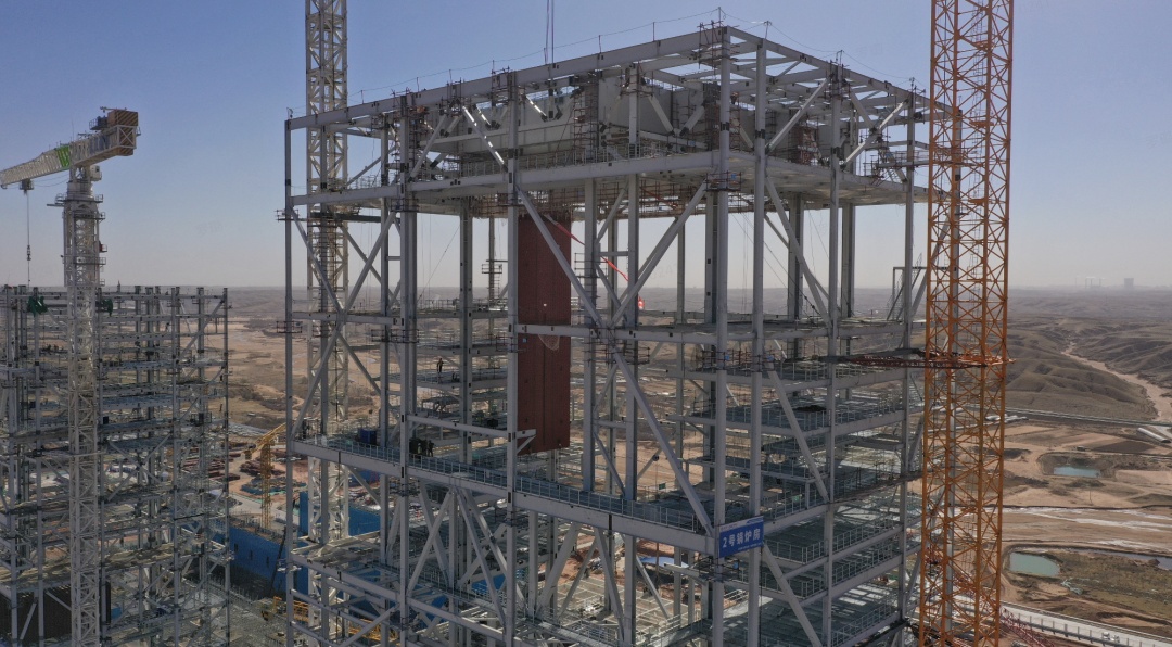 庫布其基地配套支撐性煤電項目規(guī)劃建設4臺100萬千瓦間接空冷高效超超臨界燃煤機組,是國內首個4臺百萬千瓦火電機組同步施工的項目。目前,4臺機組主廠房、鍋爐、間冷塔等工程同步推進,其中2號機組率先啟動建設,整體進度最快。該項目作為全球首批“沙戈荒”“煤電-電化學”耦合調頻調峰示范項目,可實現(xiàn)靈活調節(jié)與快速響應能力的顯著提升。項目建成后將成為庫布其基地的核心調峰電源,有力支撐新能源消納。