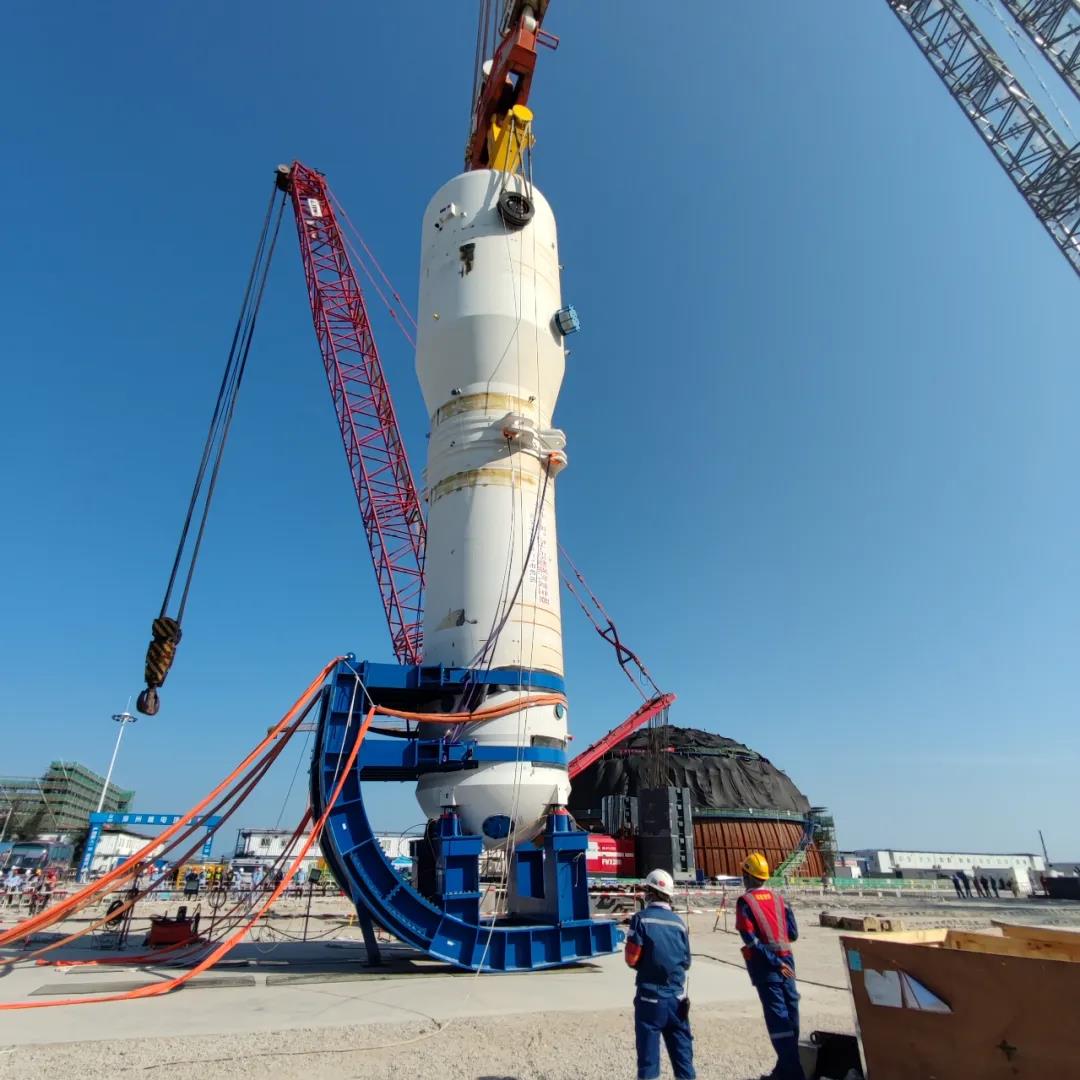 ZH-65型蒸汽發(fā)生器是華龍一號機(jī)組最核心的設(shè)備之一,是國內(nèi)首型具有完全自主知識產(chǎn)權(quán)的第三代核電蒸汽發(fā)生器。它的體積巨大,結(jié)構(gòu)復(fù)雜而精細(xì),各項(xiàng)性能優(yōu)異,其設(shè)計和制造的高技術(shù)含量代表了中國高端制造業(yè)的前沿水平。本次施工采用新型翻轉(zhuǎn)裝置,該裝置利用重力和杠桿原理,無需特殊固定措施就能使主設(shè)備和翻轉(zhuǎn)支架形成一個整體,對比傳統(tǒng)的固定支架安裝調(diào)整以及安裝、拆卸抱環(huán)等工序,操作容易、安全性高,人因失誤概率低,極大提升了施工效率和安全。