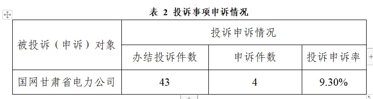 2025年12月,甘肅能源監(jiān)管辦接收申訴事項4件,甘肅能源企業(yè)辦結投訴43件,投訴申訴率9.30%,全部為國網(wǎng)甘肅省電力公司。