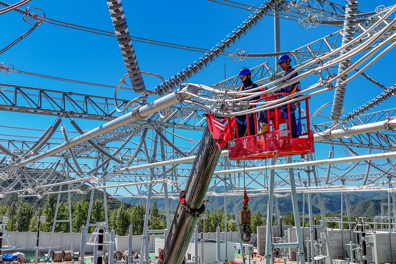 國(guó)網(wǎng)北京送變電有限公司施工人員在牌樓500千伏變電站新建工程現(xiàn)場(chǎng)安裝500千伏管母線跳線。