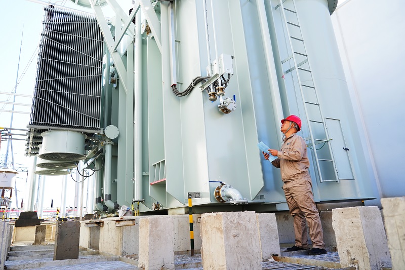 國(guó)網(wǎng)天津建設(shè)公司員工在蘆臺(tái)500千伏變電站擴(kuò)建工程現(xiàn)場(chǎng)進(jìn)行主變表計(jì)消缺復(fù)驗(yàn)工作。
