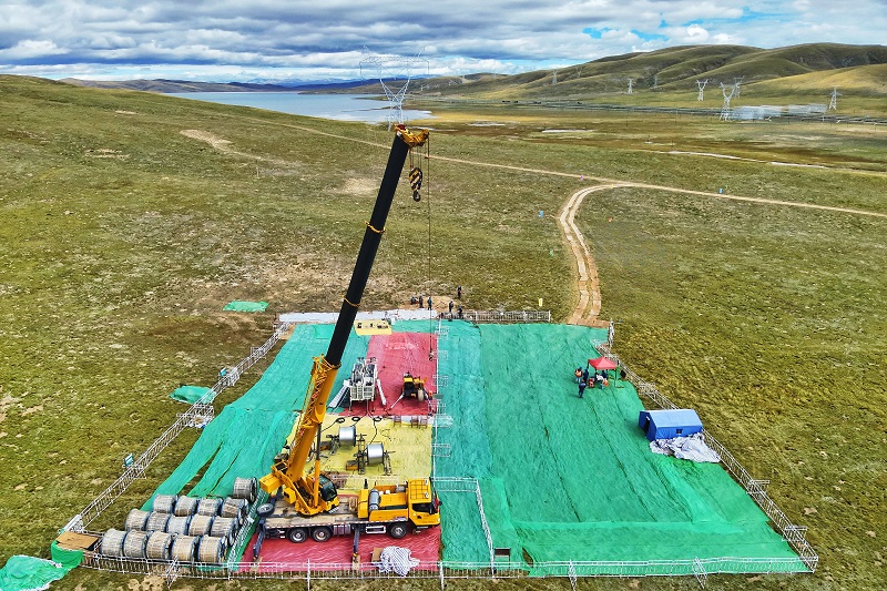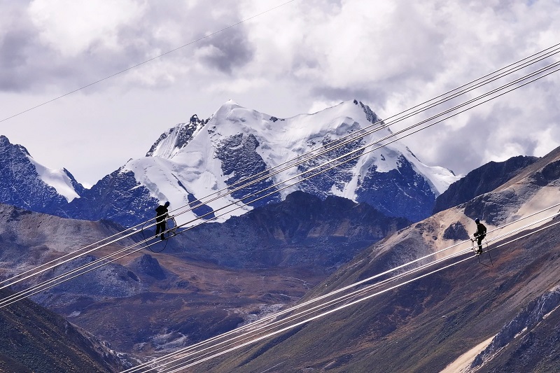 國(guó)網(wǎng)青海送變電公司施工人員在玉樹II回330千伏線路工程展放導(dǎo)線。