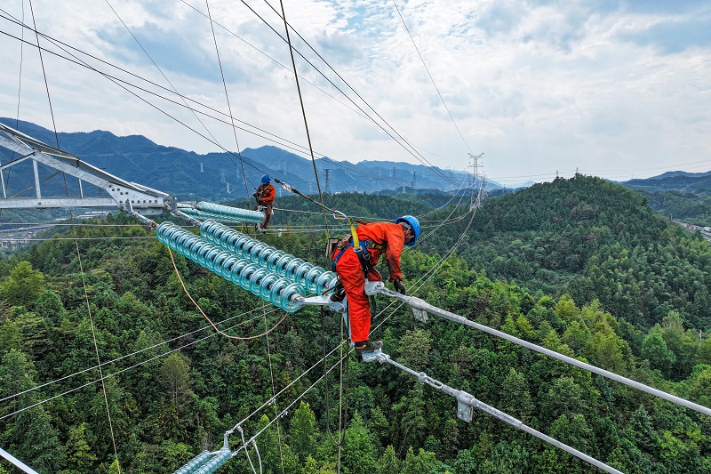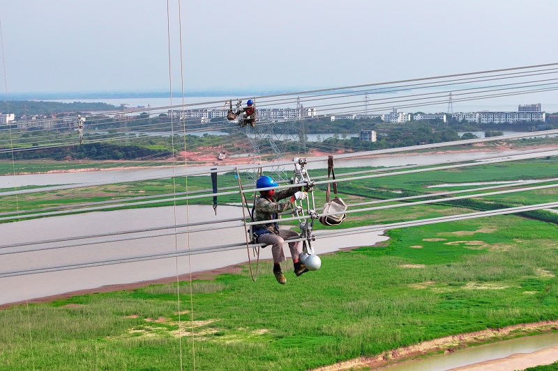 國(guó)網(wǎng)浙江送變電公司員工安裝金上—湖北±800千伏特高壓直流輸電線路工程導(dǎo)線間隔棒。