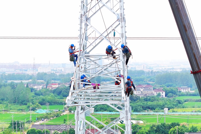 國(guó)網(wǎng)江蘇揚(yáng)州供電公司施工人員在220千伏鳳蜀線路工程立塔作業(yè)。