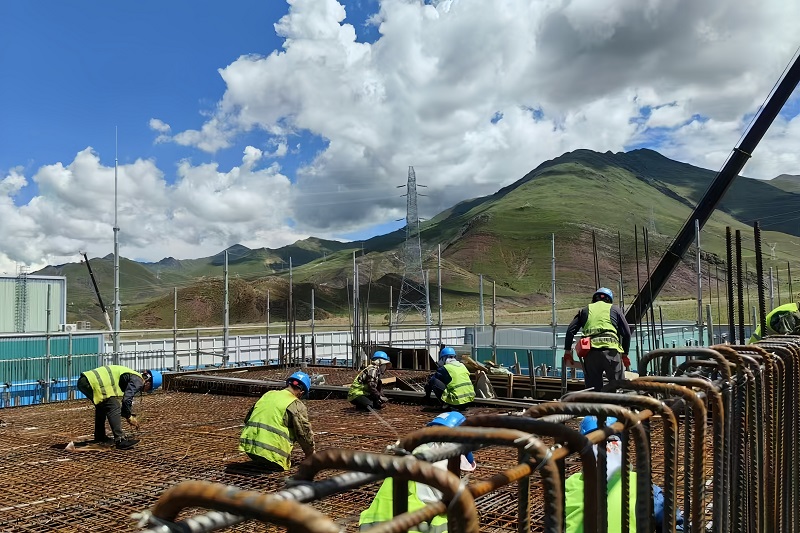 國(guó)網(wǎng)河南送變電建設(shè)有限公司施工人員在青藏聯(lián)網(wǎng)二期工程±400千伏拉薩換流站開展鋼筋綁扎作業(yè)。