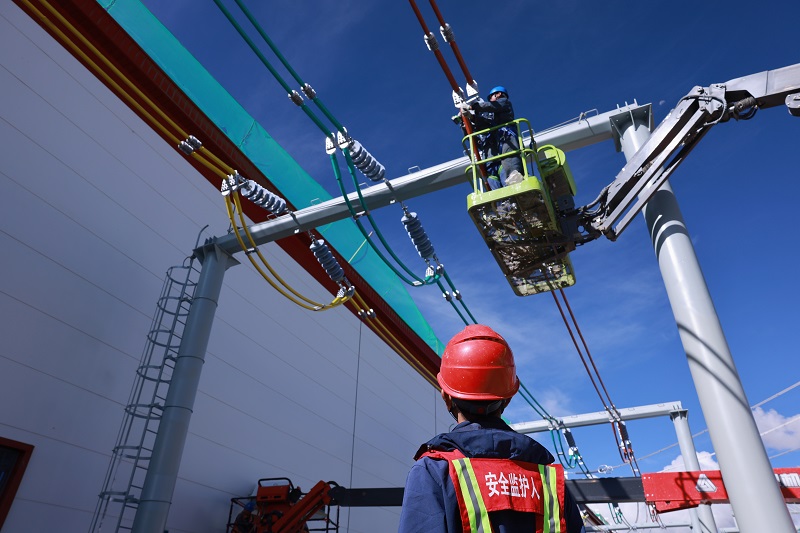 國(guó)網(wǎng)湖南送變電公司施工人員在拉薩500千伏變電站安裝35千伏母線跳線。