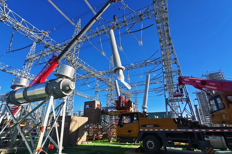 國(guó)網(wǎng)遼寧送變電公司施工人員在巴里坤±800千伏換流站開展罐式斷路器安裝作業(yè)。