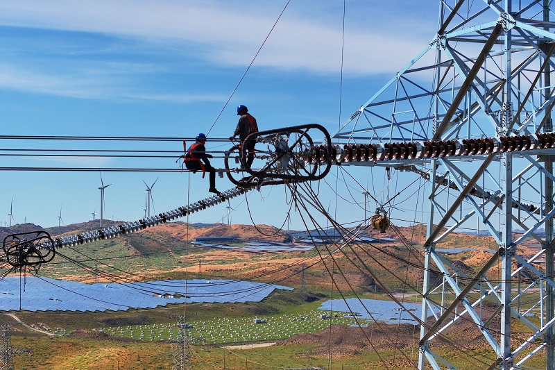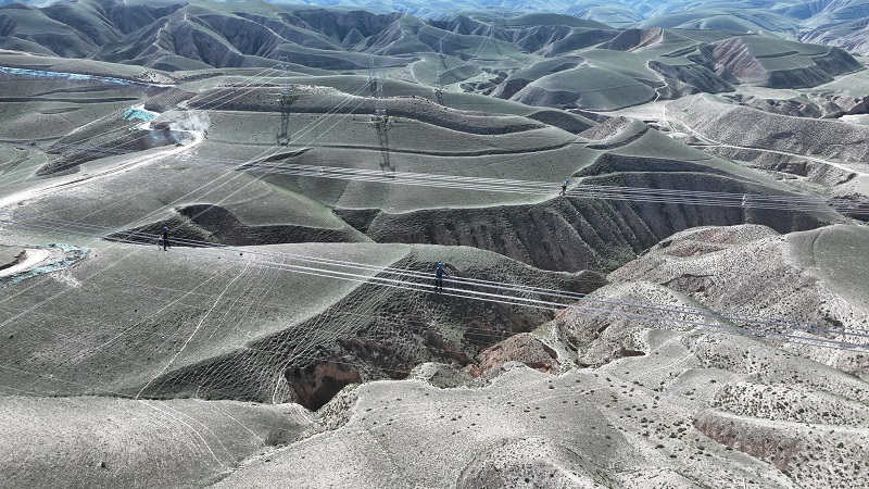 國(guó)網(wǎng)甘肅電力施工人員在哈密—重慶±800千伏特高壓直流輸電工程開展架線自檢。