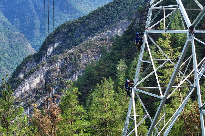 國(guó)網(wǎng)四川電力施工人員在川渝1000千伏特高壓交流工程登塔作業(yè)。