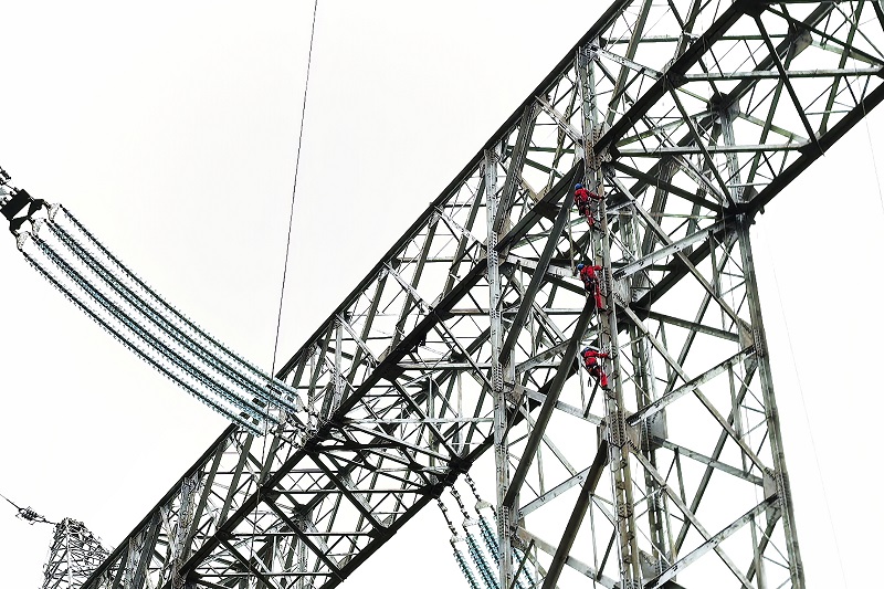 國(guó)網(wǎng)重慶送變電公司施工人員在寧夏—湖南±800千伏特高壓直流輸電線路工程登塔作業(yè)。