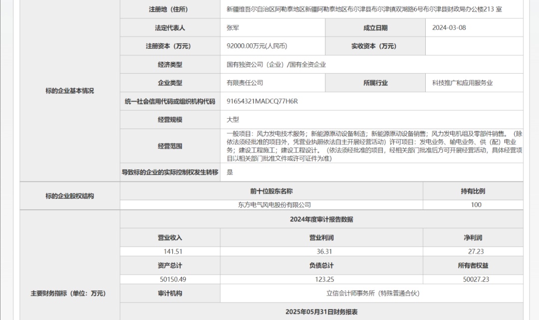 根據(jù)公開信息,該公司成立于2024年3月8日,注冊資本92000萬元。由東方電氣風(fēng)電股份有限公司100%持股。