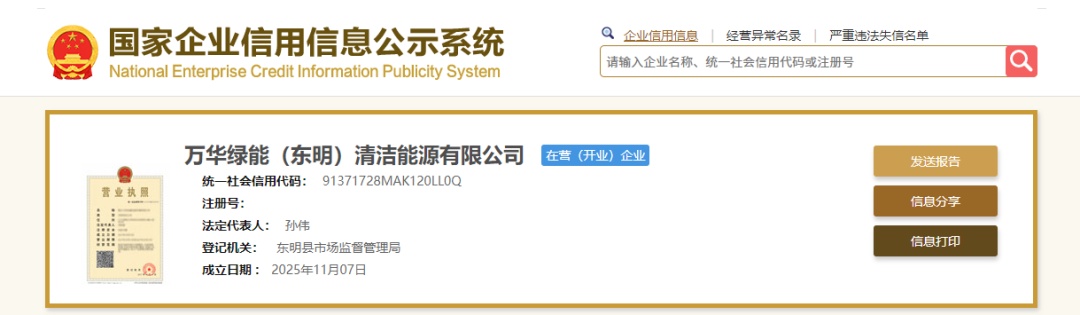 國(guó)家企業(yè)信用信息公示系統(tǒng)顯示,11月7日,萬(wàn)華綠能(東明)清潔能源有限公司成立,注冊(cè)資本7.2億元,法定代表人孫偉。