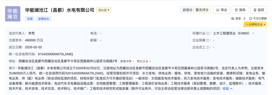 企查查網(wǎng)站顯示,2月2日,華能瀾滄江(昌都)水電有限公司正式成立,注冊(cè)資本為480000萬(wàn)元。