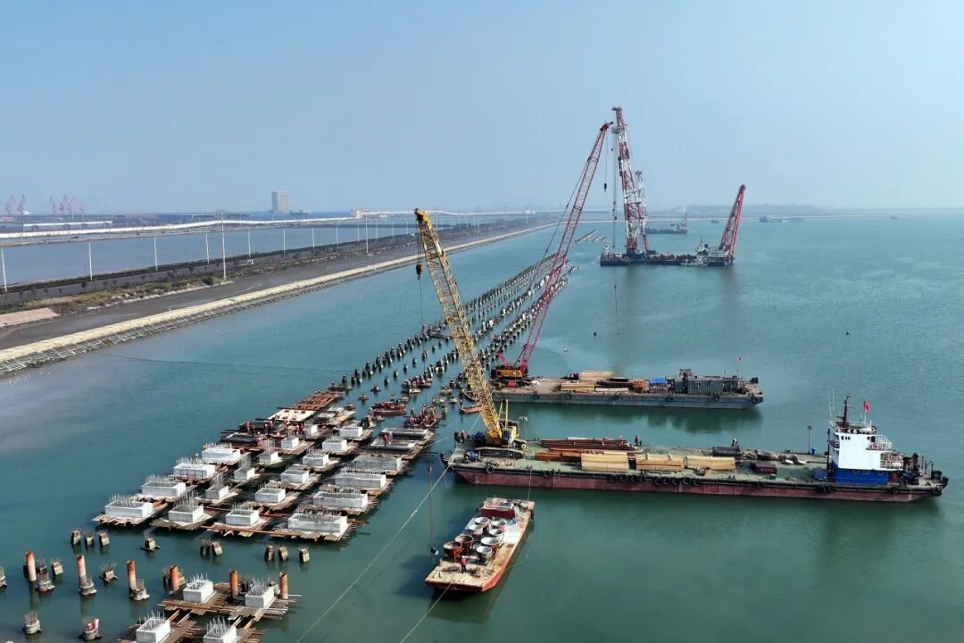 碼頭區(qū)1364根樁基已穩(wěn)穩(wěn)扎根海底,321件縱橫梁勾勒出堅(jiān)實(shí)骨架