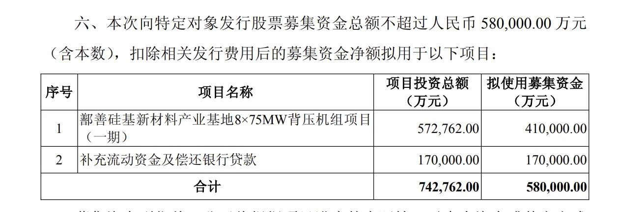 合盛硅業(yè)發(fā)布公告,擬定增募資58億元,其中,41億元用于建設(shè)鄯善硅基新材料產(chǎn)業(yè)基地8*75MW背壓機組項目(一期),剩余17億元用于補充流動資金及償還銀行貸款。