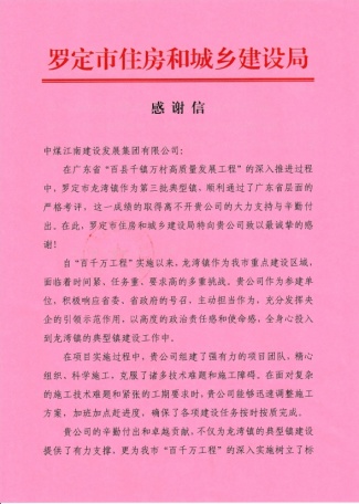 近日,中煤江南收到羅定市住房和城鄉(xiāng)建設(shè)局發(fā)來的感謝信,信中對中煤江南在“百千萬工程”中助力龍灣鎮(zhèn)典型鎮(zhèn)建設(shè)通過廣東省住房和城鄉(xiāng)建設(shè)廳考評,給予高度評價和誠摯感謝。