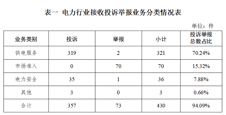 電力行業(yè)排在首位,數(shù)量為430件、占投訴舉報總數(shù)的94.09%,主要集中在供電服務(wù)、市場準(zhǔn)入、電力安全等方面。