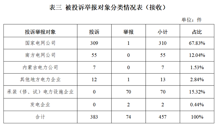 供電企業(yè)385件、占投訴舉報總數(shù)的84.24%,其中國家電網(wǎng)公司310件、占投訴舉報總數(shù)的67.83%,南方電網(wǎng)公司55件、占投訴舉報總數(shù)的12.04%,內(nèi)蒙古電力公司7件、占投訴舉報總數(shù)的1.53%,其他地方電力企業(yè)13件、占投訴舉報總數(shù)的2.84%;承裝(修、試)電力設(shè)施企業(yè)70件、占投訴舉報總數(shù)的15.32%;發(fā)電企業(yè)2件、占投訴舉報總數(shù)的0.44%。