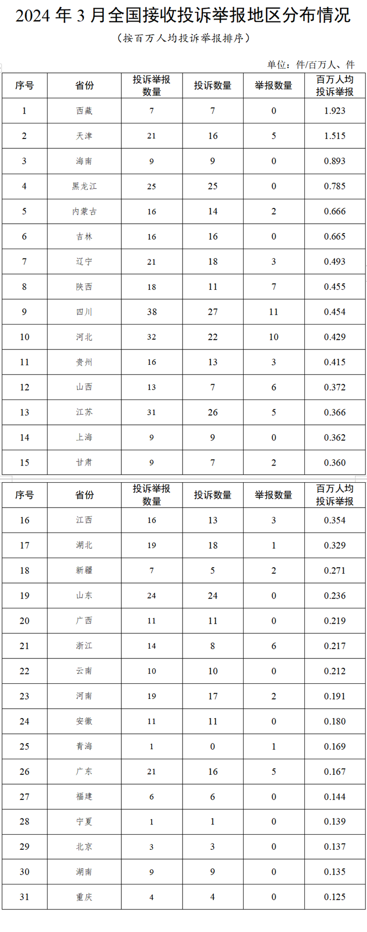 各省(自治區(qū)、直轄市)按照接收投訴舉報數(shù)量排序,四川、河北、江蘇、黑龍江、山東排在全國前5位。按百萬人均投訴舉報數(shù)量排序,西藏、天津、海南、黑龍江、內(nèi)蒙古排在全國前5位。(2024年3月全國接收投訴舉報地區(qū)分布情況,見附件1)