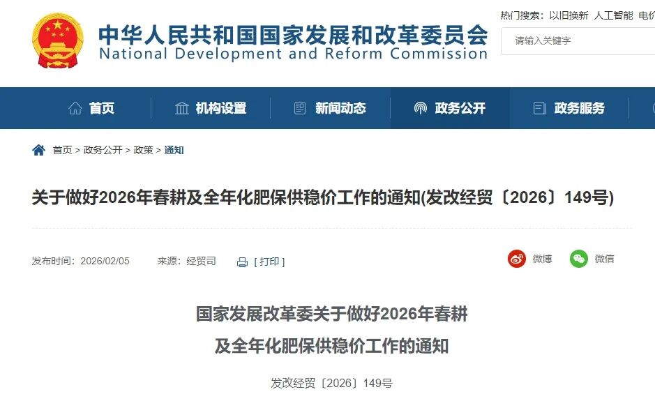 2025年,在各有關(guān)方面共同努力下,農(nóng)業(yè)用肥需求得到有效保障。經(jīng)商工業(yè)和信息化部、財政部、生態(tài)環(huán)境部、交通運(yùn)輸部、農(nóng)業(yè)農(nóng)村部、商務(wù)部、國務(wù)院國資委、海關(guān)總署、市場監(jiān)管總局、中國證監(jiān)會、國家網(wǎng)信辦、供銷合作總社,現(xiàn)就做好2026年春耕及全年化肥保供穩(wěn)價工作通知如下。