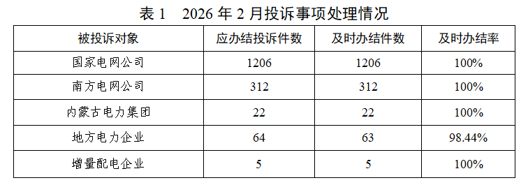能源企業(yè)應(yīng)在2026年2月份辦結(jié)投訴1609件(含上月結(jié)轉(zhuǎn)),及時(shí)辦結(jié)1608件,及時(shí)辦結(jié)率99.94%(詳見(jiàn)表1)。