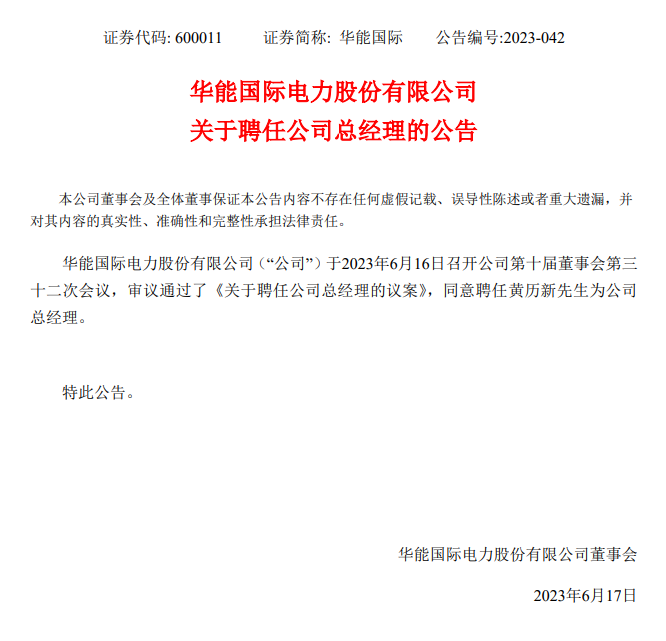 6月16日,華能國際第十屆董事會第三十二次會議,審議通過了《關于聘任公司總經(jīng)理的議案》,同意聘任黃歷新先生為公司總經(jīng)理。