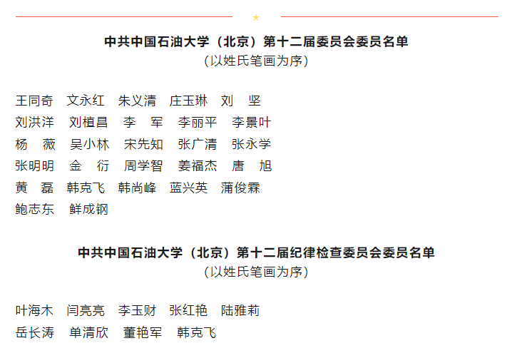 會議選舉產(chǎn)生了中國共產(chǎn)黨中國石油大學(xué)(北京)第十二屆委員會常委、書記、副書記。王同奇當(dāng)選為黨委書記,吳小林、韓克飛、文永紅、蒲俊霖當(dāng)選為黨委副書記。王同奇、吳小林、鮑志東、韓克飛、韓尚峰、金衍、文永紅、劉植昌、張廣清、蒲俊霖、劉堅(jiān)、李麗平、黃磊當(dāng)選為黨委常委。