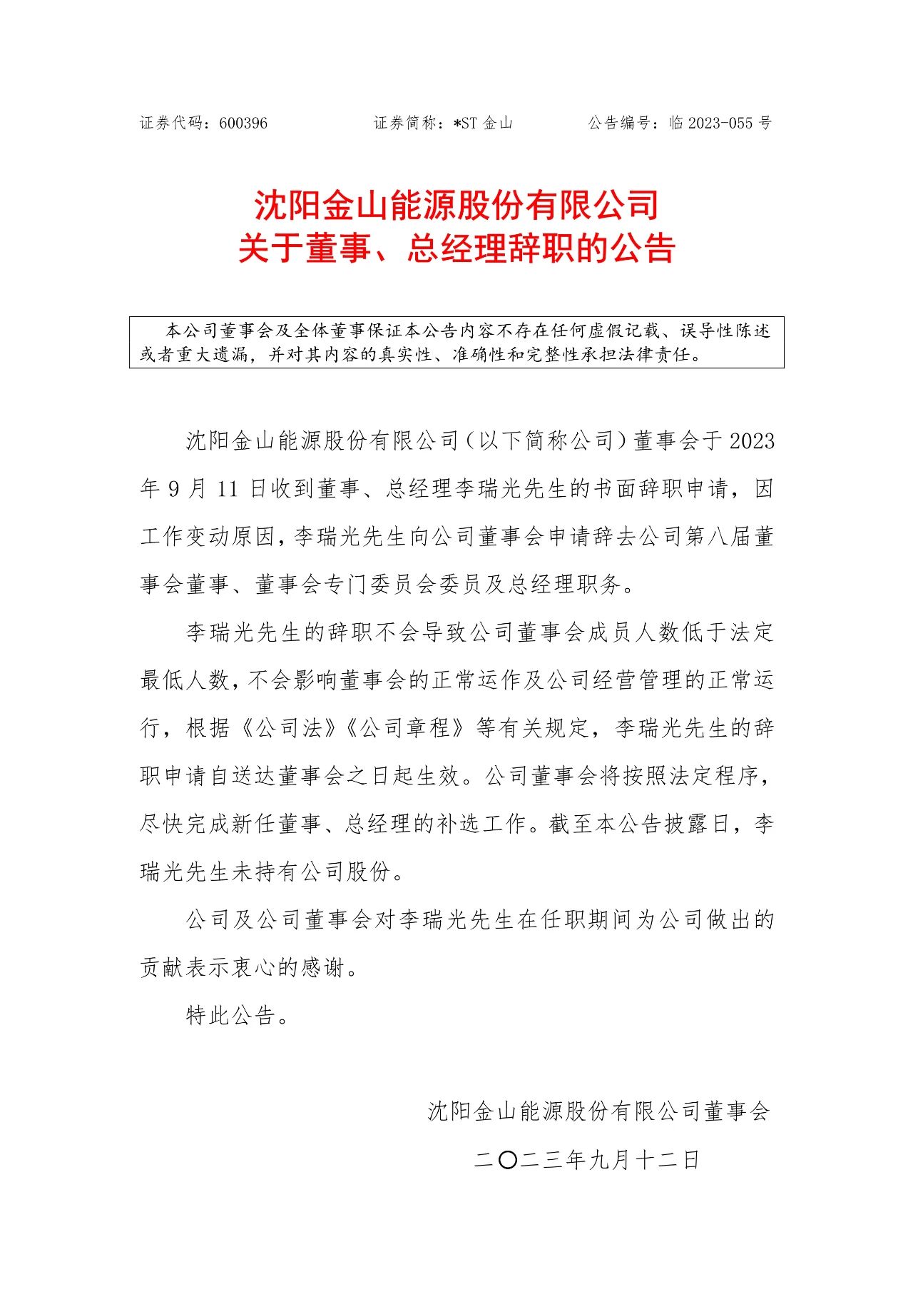 沈陽(yáng)金山能源股份有限公司發(fā)布公告稱(chēng),公司董事會(huì)于2023年9月11日收到董事、總經(jīng)理李瑞光的書(shū)面辭職申請(qǐng),因工作變動(dòng)原因,李瑞光向公司董事會(huì)申請(qǐng)辭去公司第八屆董事會(huì)董事、董事會(huì)專(zhuān)門(mén)委員會(huì)委員及總經(jīng)理職務(wù)。
