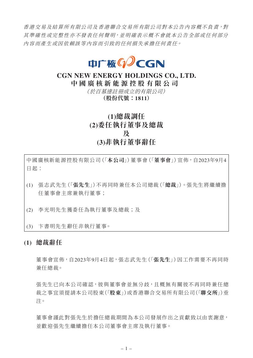 日前,中國(guó)廣核新能源控股有限公司發(fā)布《總裁調(diào)任、委任執(zhí)行董事及總裁及非執(zhí)行董事辭任》公告稱,張志武先生不再同時(shí)兼任公司總裁,將繼續(xù)擔(dān)任董事會(huì)主席兼執(zhí)行董事;李光明先生獲委任為執(zhí)行董事及總裁;卞書明先生辭任非執(zhí)行董事。