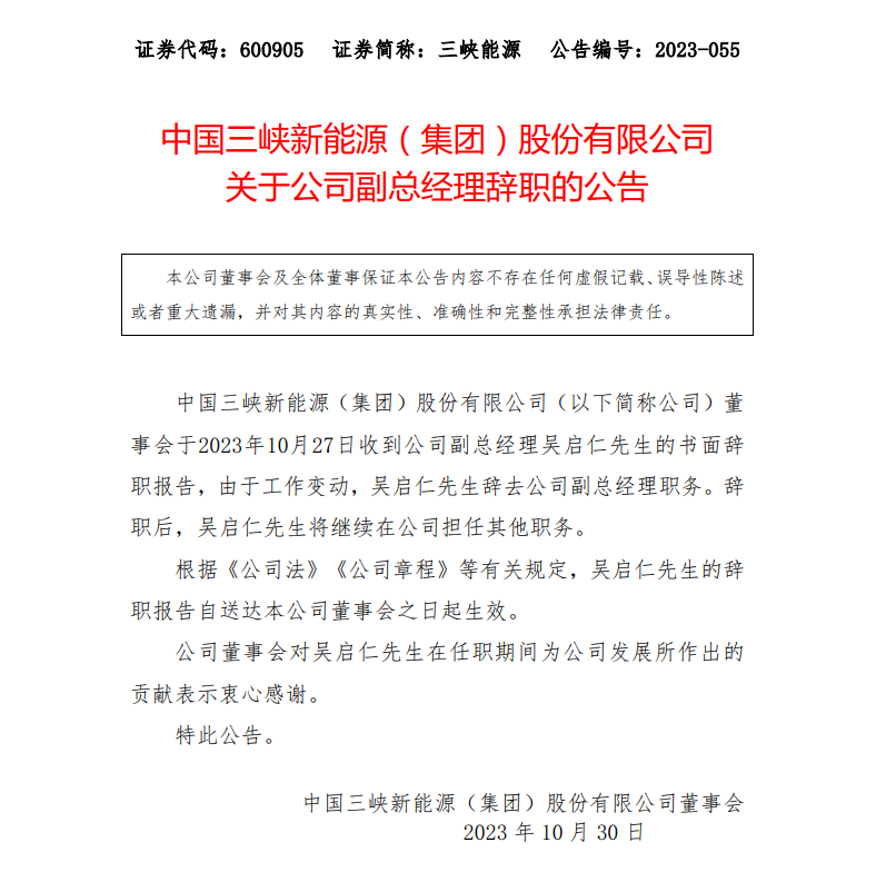 中國(guó)三峽新能源(集團(tuán))股份有限公司董事會(huì)于10月27日收到公司副總經(jīng)理吳啟仁的書(shū)面辭職報(bào)告,由于工作變動(dòng),吳啟仁辭去公司副總經(jīng)理職務(wù)。辭職后,吳啟仁將繼續(xù)在公司擔(dān)任其他職務(wù)。