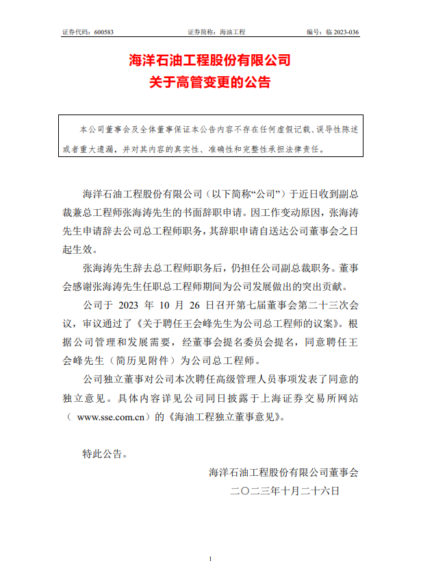 10月30日,海洋石油工程股份有限公司發(fā)布公告稱,張海濤申請(qǐng)辭去公司總工程師職務(wù)。經(jīng)董事會(huì)提名委員會(huì)提名,同意聘任王會(huì)峰為公司總工程師。