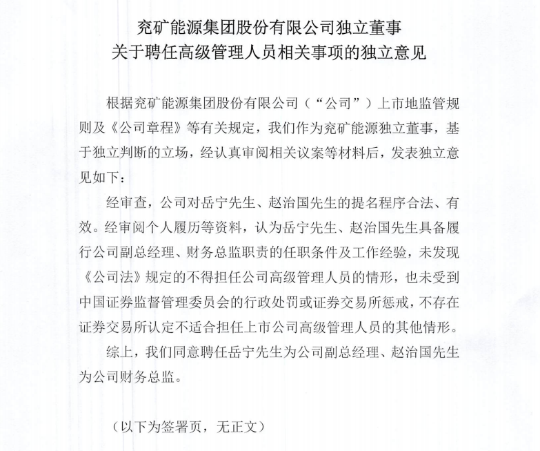 10月27日,袞礦能源集團股份有限公司發(fā)布公告,聘任岳寧為該公司副總經(jīng)理,趙治國為公司財務總監(jiān)。